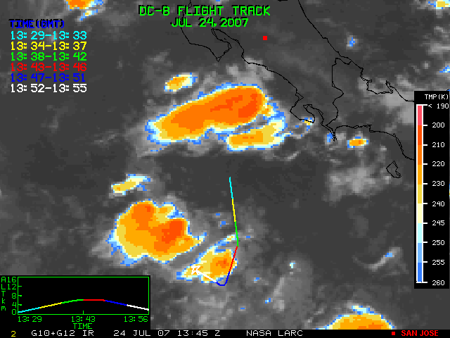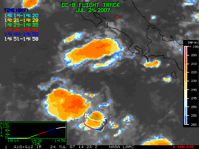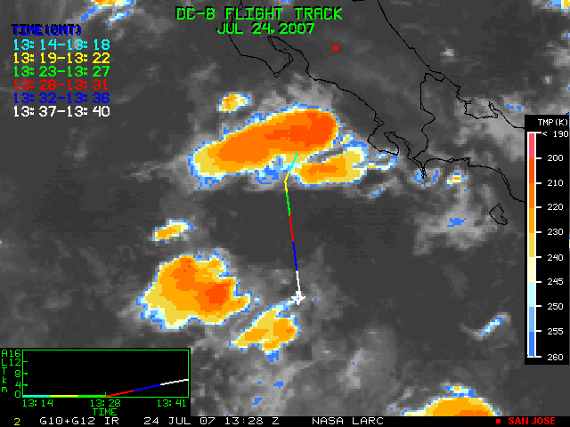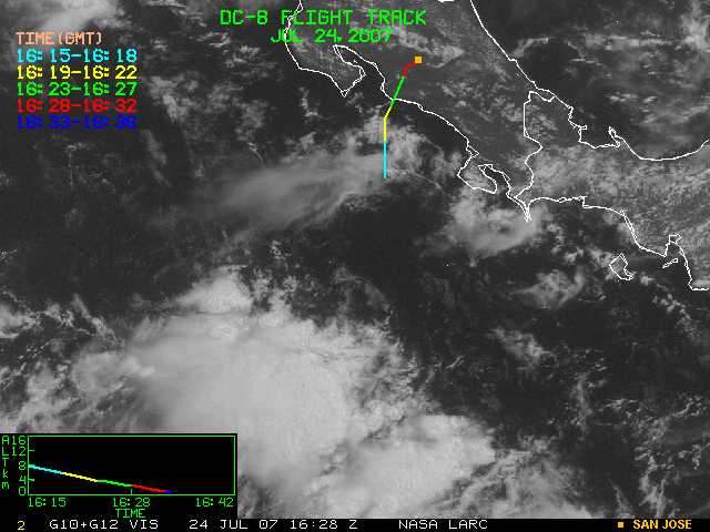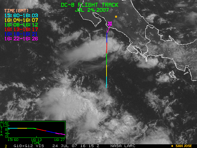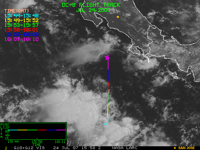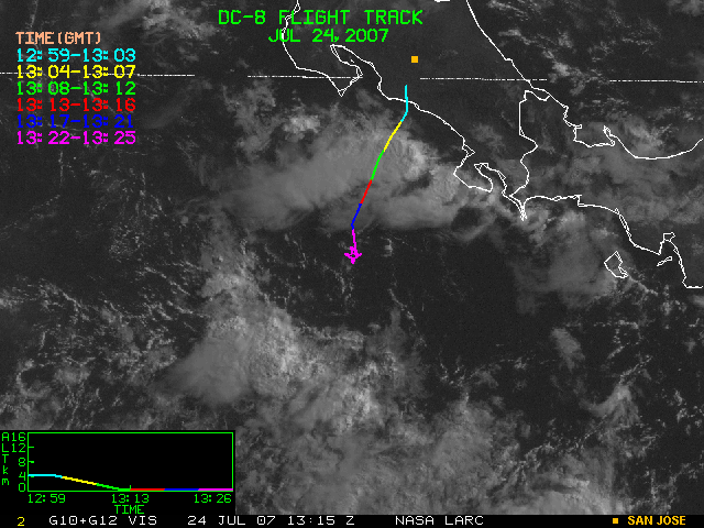 GOES (G10+G12) Visible image (24 July 2007 14:45 UTC) showing DC8 flight track
