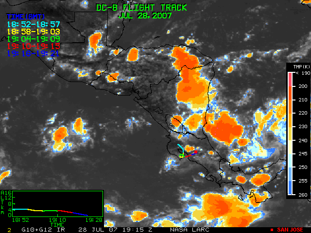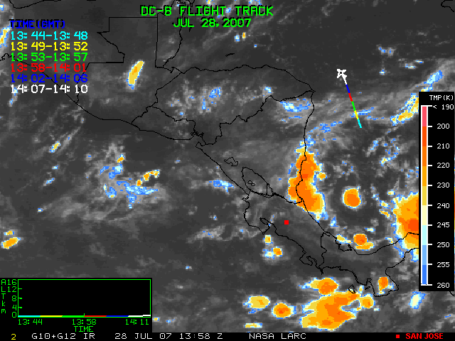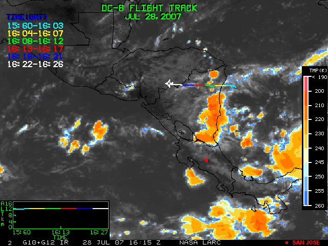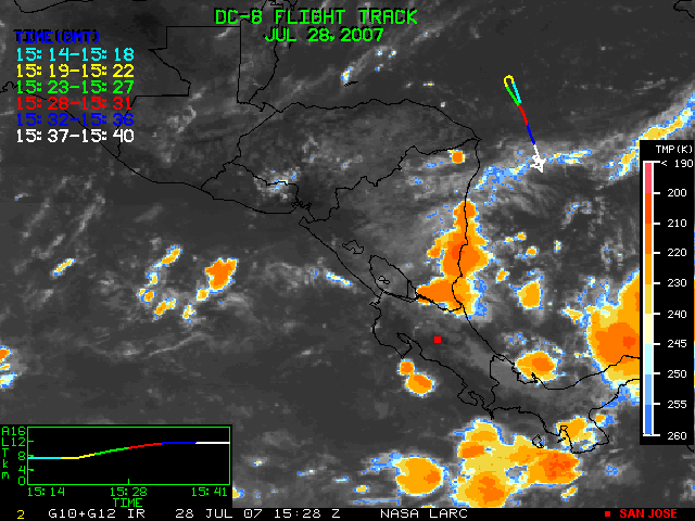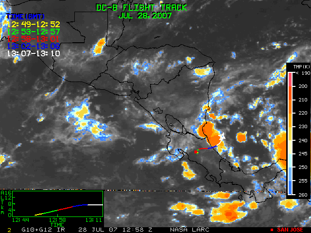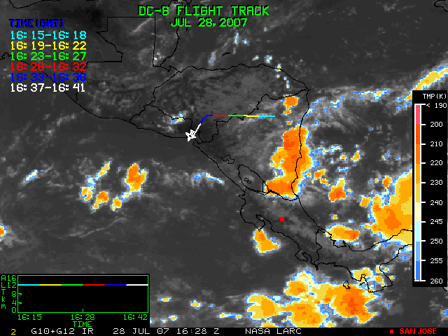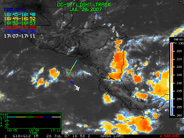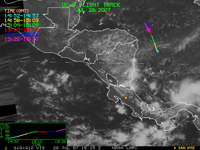 GOES (G10+G12) Visible image (28 July 2007 15:58 UTC) showing DC8 flight track