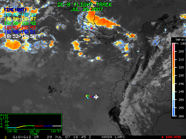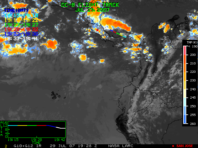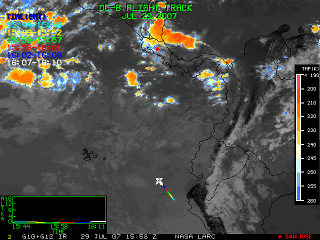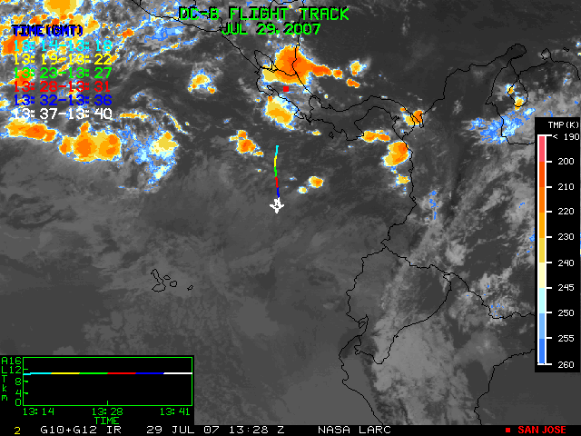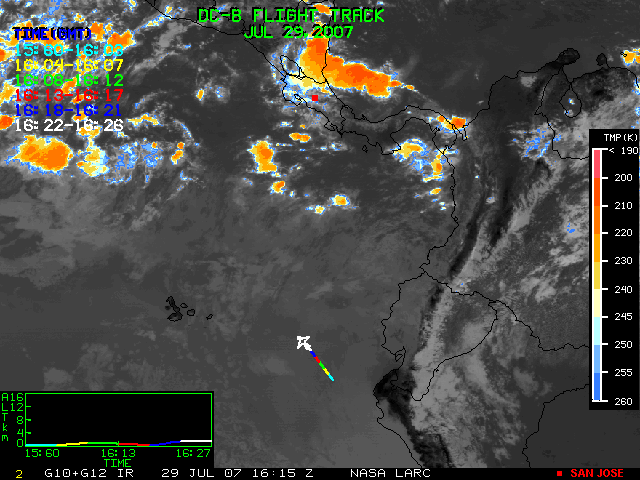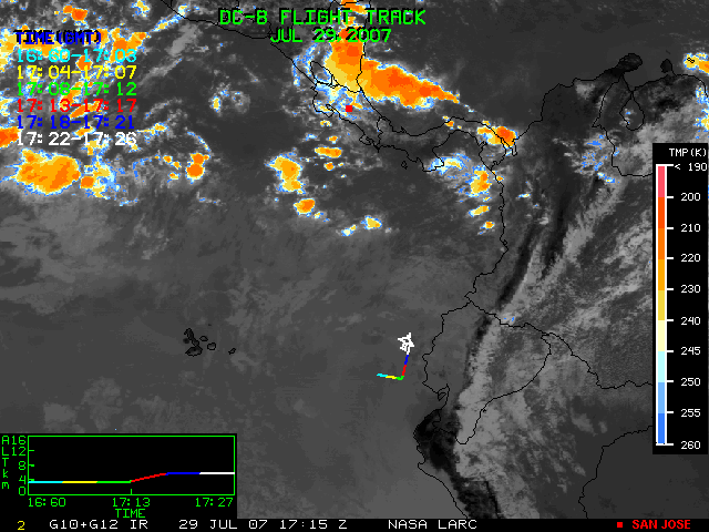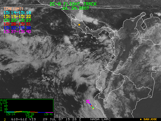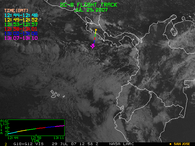 GOES (G10+G12) Visible image (29 July 2007 16:28 UTC) showing DC8 flight track